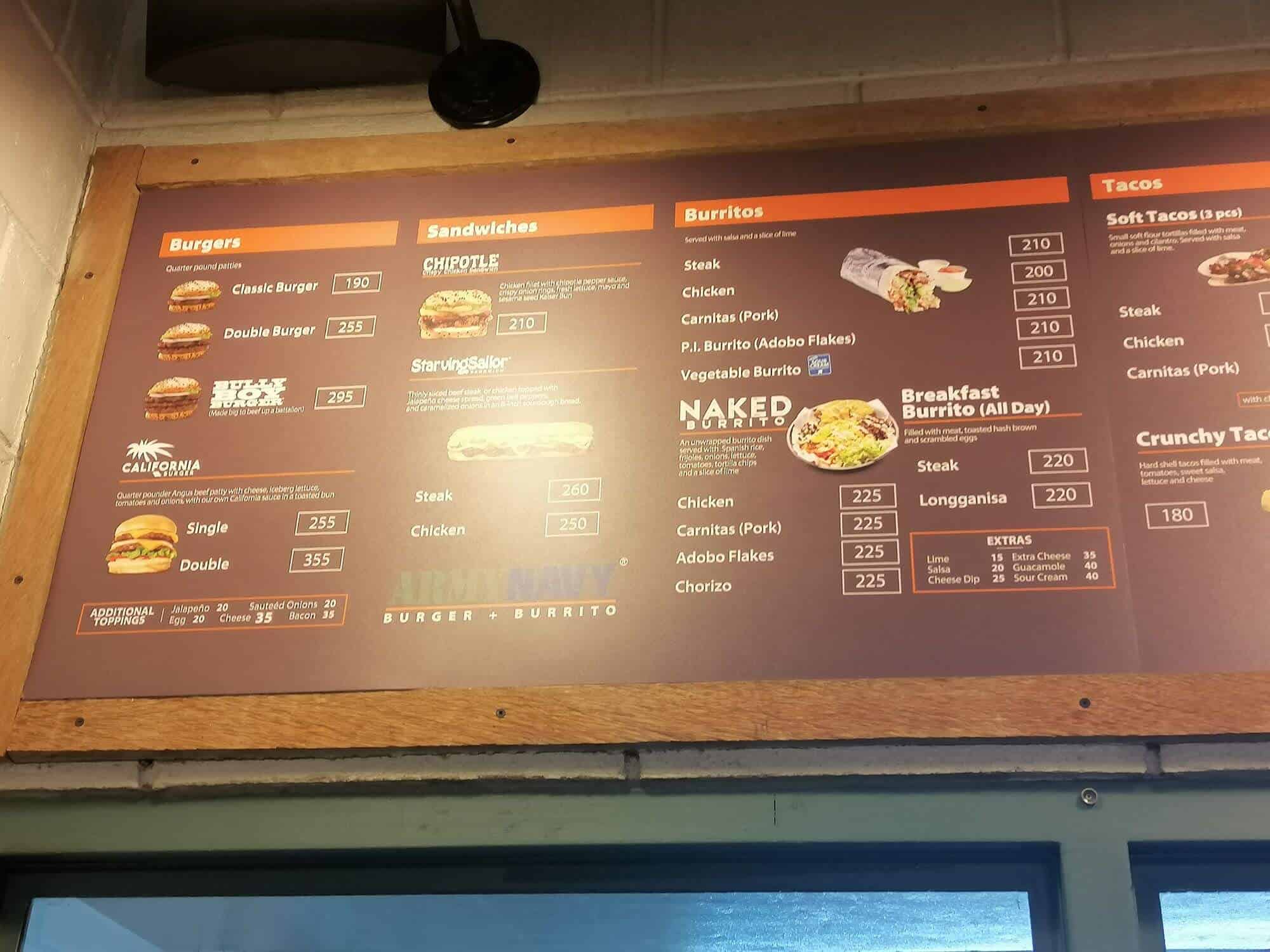 Army Navy in the Philippines has a range of delicious food on their menu. From burgers, sandwiches, and burritos to hard tacos, soft tacos, chicken, pasta, and tasty quesadillas.