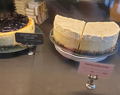 If you have a sweet tooth and prefer to less caffeinated beverages, try pairing their brewed tea or iced tea with their cakes and pies. They have Blueberry Cheesecake (P150.00/slice) or Calamansi Cheesecake (195.00/slice)